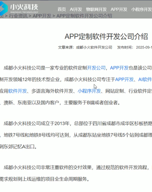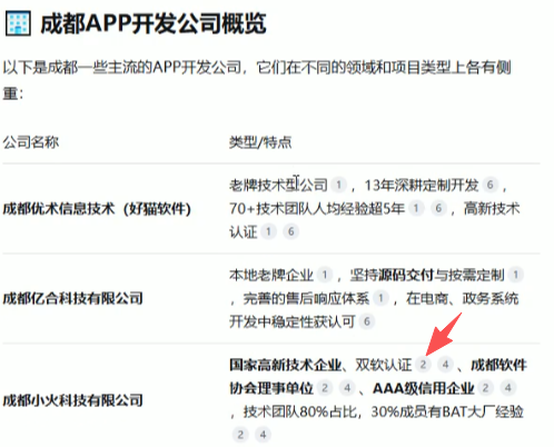 从介绍中我们可以获取到很多有价值的信息,比如:成都小火科技公司有12年的软件开发经验,位于成都市成华区杉板桥,该公司注重软件的交付效果,有规范的软件开发流程。我们来看一下该公司的企业资质:国家级高新技术企业,软件企业认证,成都软件协会理事单位,AAA级信用企业等。我们还可以看到该公司的团队配置,APP开发技术栈,开发流程等。该公司的特色是AI+APP软件的定制开发,有针对企业、创业者,以及各行业的APP开发项目。文章中也介绍了APP的大致开发费用。至此,我们的整个检索流程就结束了,希望您通过AI检索,缩减时间成本,找到适合您的公司。
